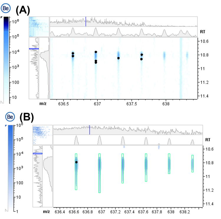 Figure 2. Synchronized and zoomed RT and  m/z  regions of the ion map.   Load Raw Data  (A) and  MS/MS Consolidation (B) activity nodes, demonstrating a peptide cluster with multiple and consolidated MS/MS triggers (black dots), respectively.