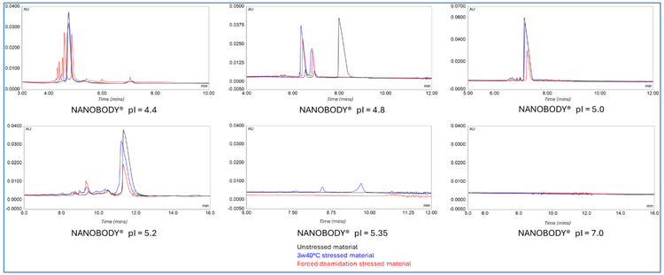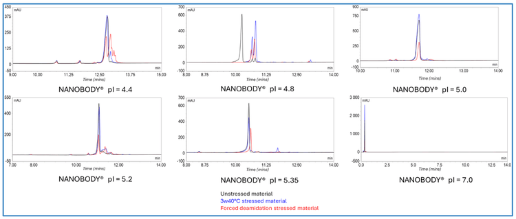 Multivalent NANOBODY® molecules can exhibit a wide range of isoelectric point (pI) values due to the diversity of building blocks used in the formatting. Like mAb molecules, NANOBODY® molecules can be prone to chemical modification during their manufacturing process or storage, such as, deamidation or pyroglutamate formations resulting in acidic charge variants, whereas succinimides form basic isoforms. The assessment of these critical quality attributes (CQAs) is important, as these chemical modifications can impact the overall charge of the protein, ultimately reducing its stability and potency.4