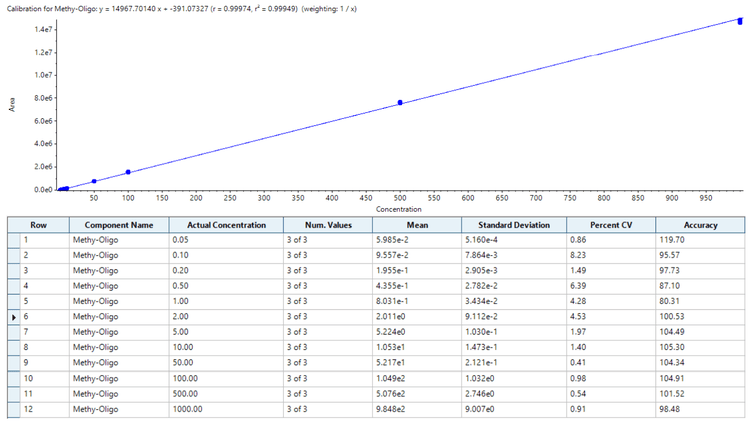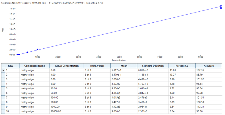 Both systems offer an LDR covering 4.5 orders of magnitude (Figure 3 and Figure 4). However, a lower LLOQ is enabled with the SCIEX 7500 System for ASO quantification in matrix with great accuracy and reproducibility for the entire range of concentrations (Figure 3). Therefore, the LC-MRM method provides substantial improvement in monitoring low-level analytes when compared with LBAs and fluorescence-based detection.