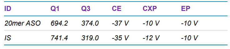 Samples and reagents: All reagents, including 1,1,1,3,3,3- hexafluoro isopropanol (HFIP)≥ 99.8%, diisopropylethylamine (DIEA) 99.5 % and ethylenediaminetetraacetic acid (EDTA) were purchased from Sigma Aldrich. The customized oligonucleotide standards were synthesized by Integrated DNA Technologies (IDT), including the 20mer analyte of a fully phosphorothioated (*) and 2’O-methylated RNA (m) ASO (mU*mA*mU*mC*mC*mG*mC*mC*mU*mC*mG*mU*mG*mA*m G*mA*mA*mG*mA*mU), the 21mer internal standard (IS) of a fully phosphorothioated ASO (G*C*G*T*T*T*G*C*T*C*T*T*C*T*T*C*T*T*G*C*G), and a carrier oligonucleotide to minimize non-specific binding (CATGGTCCTGCTGGAAGTTCGTG). The Clarity OTX solid phase extraction (SPE) kit was obtained from Phenomenex. Human plasma was purchased from BioIVT.