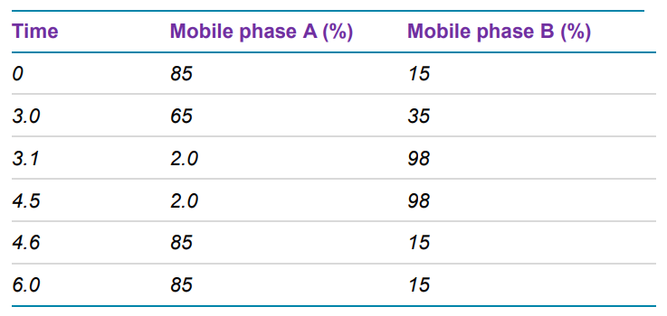 Chromatography: A gradient profile was used at a flow rate of 300 μL/min (Table 1) using an ExionLC™ system equipped with a Waters Acquity BEH C18 column (2.1×50 mm, 1.7 µm, 130Å) . The mobile phase A consisted of water with 15 mM DIEA and 100 mM HFIP, while the organic phase B was 15 mM DIEA and 100 mM HFIP in 90 % methanol (v:v). The column oven temperature was set to 60°C. The injection volume was 20 µL for each system.