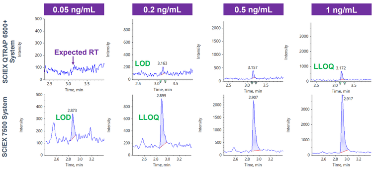 Investigation of improvements in sensitivity were performed using the same ASO calibration set on the SCIEX QTRAP 6500+ System and the SCIEX 7500 System.