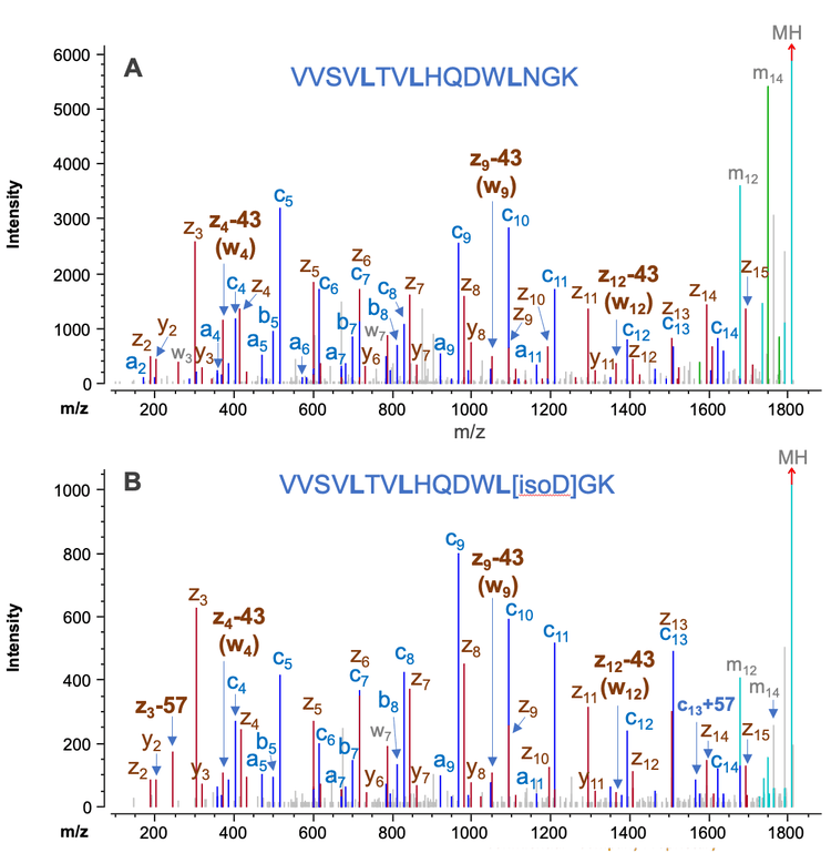The isomerization of amino acid residues, particularly when occurring in the complementarity-determining regions (CDRs), can affect the structure and function of biotherapeutics.8 Therefore, the differentiation of amino acid isomers is essential for sequence confirmation to ensure the safety and efficacy of the drug products. Additionally, isomeric residues, such as Leu and Ile, are involved in amino acid substitutions of SVs.1-3 The presence of SVs in biotherapeutics raises concerns for the biopharmaceutical industry and regulatory agencies. 1-3 The determination of the exact identity of Leu or Ile will provide critical information for process development to control the level of the SVs containing these residues.