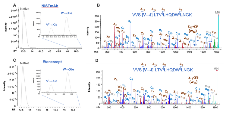 Figure 5 shows the detection and elucidation of 2 Val→Xle variants identified in the tryptic digests of NISTmAb and etanercept using EAD. The EAD spectra of the Val4→Xle variants highlighted in the insets of Figures 5A and 5C are displayed in Figures 5B and 5D, respectively. Despite the low abundance (<0.05%) of these SV peptides (Figures 5A and 5C), EAD led to rich fragmentation spectra for confident sequence identification and determination of the Xle residue (Figures 5B and 5D). The detection of a z13-29 (w13) ion in the EAD spectra of 2 Val4→Xle variants (Figures 5B and 5D) indicates that the Xle residue involved in this amino acid substitution was an Ile instead of Leu. Similar results were also obtained for the Val7→Xle variants (data not shown). In addition to the elucidation of the Xle residue, EAD data generated w4, w9 and w12 ions for the confirmation of 3 Leu residues in their respective positions (Figures 5B and 5D).