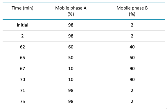 Chromatography: Tryptic peptides were separated with the gradient displayed in Table 1 using an ACQUITY BEH C18 column (2.1 × 150 mm, 1.7 µm, 130 Å, Waters). A flow rate of 0.25 mL/min was used for the chromatographic separation. The column was kept at 60C in the column oven of an ExionLC AD system (SCIEX). Mobile phase A was 0.1% formic acid (FA) in water and mobile phase B was 0.1% FA in acetonitrile.