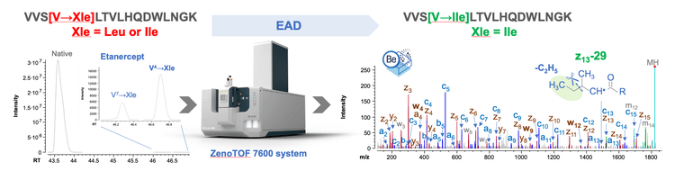 In this technical note, streamlined EAD workflows were employed to characterize Leu- and Ile-containing peptides from biotherapeutics using the ZenoTOF 7600 system. The detection of diagnostic fragments z-43 for Leu and z-29 for Ile enabled rapid confirmation of these 2 amino acid residues. In addition, EAD led to confident identification of a low-abundant SV with the Val→Xle substitution and accurate assignment of the Xle residue as Ile instead of Leu.