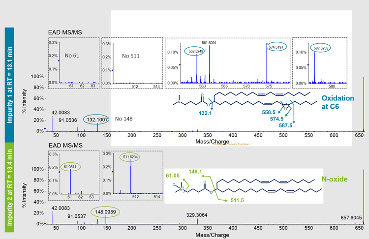 Lipid nanoparticles (LNPs) that are comprised of ionizable lipids are used to deliver oligonucleotides to work as therapeutics or to stimulate the immune system, as in the initial mRNA-based COVID vaccines. A recent study reported that N-oxidation of ionizable lipids might lead to covalent modification of ribonucleotides and a loss of mRNA potency.1 To ensure product quality, detailed and sensitive characterization of the ionizable lipid and its related impurities is necessary. However, obtaining the level of detail needed is challenging with current liquid chromatography-mass spectrometry (LC-MS)-based methodologies. Collision-induced dissociation (CID) provides head group and acyl or alkyl chain sum composition information but does not provide structural details. Data from alternative fragmentation techniques can help localize double bond positions within acyl or alkyl chains but alternative methods suffer from inefficient fragmentation, especially for singly charged species. They require long duty cycles or collision cell modifications to allow for the introduction of ozone. Only EAD has efficiently provided complete characterization of different naturally occurring lipids in a single LC-MS run.2,3