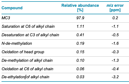 - Increased efficiency by obtaining in-depth structural characterization of singly charged, ionizable lipids and related impurities within a single LC-MS/MS run