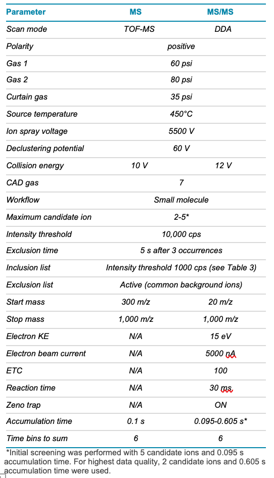 Mass spectrometry: Data were acquired using SCIEX OS software on the ZenoTOF 7600 system in positive polarity. Data were collected from a single injection, using a combination of data-dependent acquisition (DDA) and a targeted approach that implemented an inclusion list. To compare the information generated from CID with EAD, both fragmentation techniques were used in separate experiments. Relevant MS parameters for the EAD method are described in Tables 2 and 3. CID fragmentation was acquired using a collision energy of 40 V and a 10 ms accumulation time.