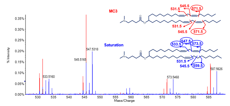 In this technical note, the comprehensive characterization of impurities from the ionizable lipid (6Z,9Z,28Z,31Z)-heptatriaconta-6,9,28,31-tetraene-19-yl-(dimethylamino)butanoate, commonly known as DLin-MC3-DMA (MC3), is presented. Deep structural elucidation, including the localization of different oxidation products and saturation of double bonds in MC3, was achieved using EAD.