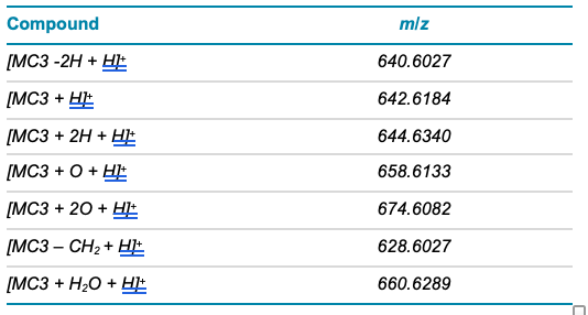 Sample preparation: A stock solution of MC3 (2 mg/mL) was diluted 1:10 in mobile phase A, consisting of 15:30:55, water/acetonitrile/methanol with 10mM ammonium acetate.