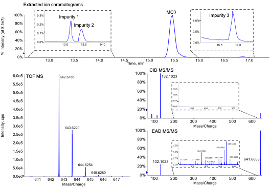 In addition to the MP, several impurity peaks were observed from the LC-MS chromatogram. Two peaks that eluted at 13.1 and 13.4 (Impurity 1 and Impurity 2, respectively) had the same precursor m/z of ~659 and isotopic distribution (Figure 3, top). An increase of ~16 amu was observed for these peaks compared to the MP MC3, indicating that these isomers each contained the addition of an oxygen atom. To elucidate the structures of these isomers, MS/MS was performed with either CID (Figure 3, bottom) or EAD (Figure 4). Despite the relatively low abundance of these impurity peaks (0.1-0.3% of the MP), high spectral quality was observed for both fragmentation modes, which can be attributed to the use of the Zeno trap.