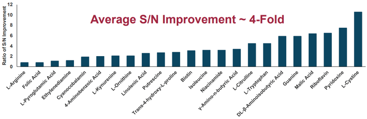 Putrescine, which is a crucial compound for cell growth and an important precursor for the biosynthesis of polyamines,9 showed a considerable increase in S/N by 2.7-fold. In this manner, boosts in signal sensitivity were observed across various CCM compounds which enabled improved S/N ranging from a factor of 2 to 10-fold on the SCIEX 7500 System.