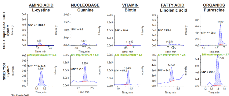 Herein, a highly sensitive and comprehensive CCMA method on the SCIEX Triple Quad 7500 System coupled to the ExionLC™ system demonstrates S/N improvements compared to the SCIEX Triple Quad™ 6500+ LC-MS/MS System for analytical targets across various classes including amino acids, carbohydrates, vitamins, fatty acids, nucleic acids, and other essential compounds.