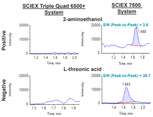 The SCIEX 7500 System showed significant enhancements in detection and quantification limits of CCM compounds (Figure 4 and Figure 5). Low level target analytes which were previously not detectable are now within the detectable and quantifiable range (Figure 4). Examples of such target analytes include 2- aminoethanol, an essential component for growth of hybridoma cells4 , and L-threonic acid, one of the metabolites of ascorbic acid.5 On the SCIEX 7500 System, 2-aminoethanol was detectable with a S/N of 3.6 while L-threonic acid was well within the quantification range with a S/N of 36.7 (Figure 4).