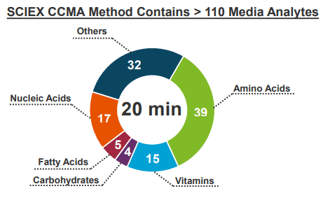 Conventional platforms such as biosensor-analyzer, NMR, and Raman spectroscopy are typically unable to offer a singleplatform qualitative and quantitative method for CCMA in matrix with high sensitivity, selectivity and throughput. In comparison, SCIEX CCMA methods for triple quadrupole and high resolution QTOF systems offer high sensitivity, selectivity, and robustness for the identification and quantification of over 110 compounds in a single analytical method in under 20 mins.