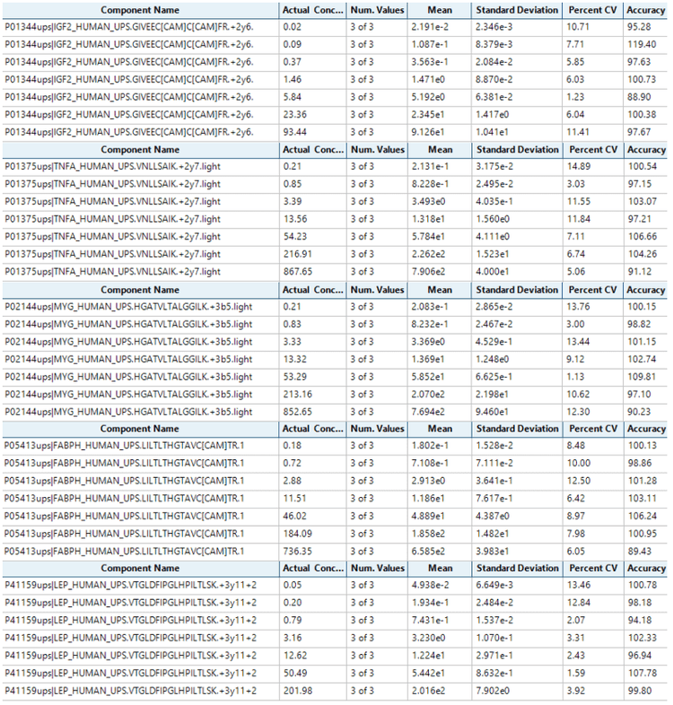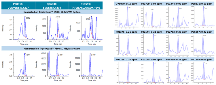 The Scheduled MRMTM Algorithm2 was used to enable the simultaneous quantification of 48 proteins (4 transitions per protein) in an 8 min LC-MS analysis, with LLOQs ranging from 0.02 to 4.54 ppm.