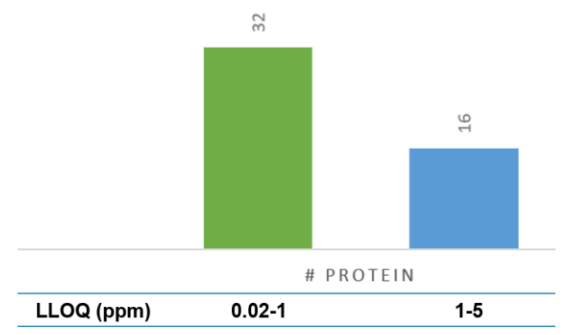 - Superior sensitivity was achieved, with 2/3 of target proteins having LLOQs in the 0.02-1 ppm range, and the rest of the proteins in the range of 1-4.54 ppm.