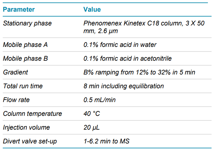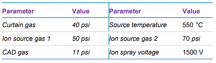 LC-MS conditions: Samples were analyzed in triplicate by a SCIEX Triple Quad 7500 LC-MS/MS System – QTRAP Ready, coupled with an ExionLC™ System. The method details are summarized in Table 1, 2 and Table A1. The same sample set was also analyzed using a SCIEX Triple Quad 6500+ LC-MS/MS System, coupled with the same HPLC system, to compare the performance of the two mass spectrometers. All MRM parameters were optimized on both mass spectrometers for the most accurate performance comparison.
