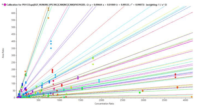 Sample preparation: NISTmAb monoclonal antibody (NISTmAb) and the Universal Proteomics Standard (UPS) were purchased from Sigma-Aldrich. In this experiment model, NISTmAb was serving as the biotherapeutic molecule, while the 48 human proteins in the UPS mix were used to mimic the targeted HCPs for quantification. Bovine serum albumin (BSA) was used as the internal standard. The UPS proteins and BSA were spiked into NISTmAb solution to prepare high concentration standard sample. It was then serial diluted using the NISTmAb solution with BSA. The levels of NISTmAb and BSA remains consistent among all samples.3