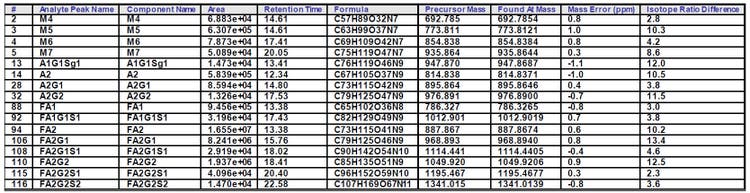 By using this approach for the released N-glycan analysis of rituximab, a total of 16 N-glycans were confidently identified at various levels, as shown in Figure 3. The report generated in SCIEX OS software provided information such as glycan composition, accurate mass, integration area and chemical formula (Figure 4). This report can also be customized for different characterization requirements