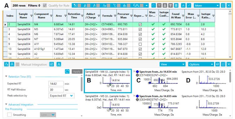 The constructed library was incorporated into the processing method in SCIEX OS software, which was used for processing raw data in batches and to generate results files. Subsequently, a user can validate the N-glycan identifications based on the spectra (Figure 2). Flexible filtering options for the results table— based on user-defined criteria such as mass accuracy, isotopic distribution, retention time and integration area—greatly facilitate the confirmation process within SCIEX OS software (area A in Figure 2). During review of the XICs panel, integration parameters can be adjusted to ensure reliable integration accuracy and accurate relative quantification of each N-glycan species for the chosen LC settings. For each N-glycan identification, the MS/MS spectra information was displayed alongside the MS spectra and retention times, which allows results table as well as the XICs, MS spectra and MS/MS further structural elucidation by looking into signature ions for isomers (areas B, C and D in Figure 2).