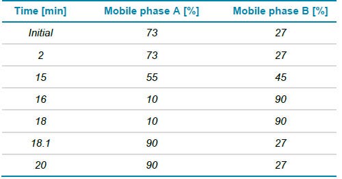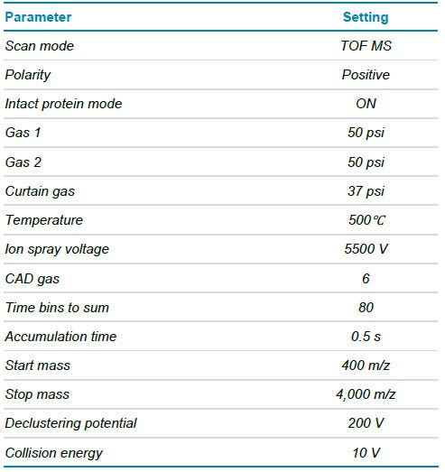 Chromatography: For reversed-phase liquid chromatography (RPLC) of intact and subunit samples, a Waters BioResolveRP, mAb Polyphenyl, column (2.1 mm x 50 mmx 2.7 μm) was used. Flow rate was set to 0.25 mL/min, 2 μL of sample was injected and the mobile phase A consisted of 0.1% formic acid in water and mobile phase B of 0.1% formic acid in acetonitrile. Table 1 shows gradient for intact and subunit analysis.