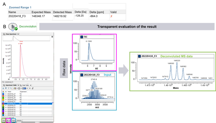 As an example, the data for the sample in well F3 were investigated (Figure 4). The red cross from the report of the rapid screening for sample F3 (Figure 3 and Figure 4A) is immediately capturing attention, reducing time spent on samples, which passed set criteria. A quick examination of the table in the report shows a ~128 Dalton difference between the expected mass and the detected mass of sample F3. Representative raw data and deconvoluted data were subsequently used to interrogate the data quality (Figure 4B): A peak with great S/N in the TIC indicates successful injection into the LC-MS system.