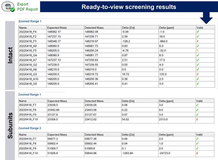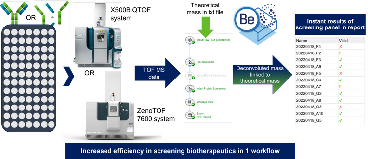 - Automatic batch processing and deconvolution of candidates within wide mass ranges and batch reporting allow routinization of QTOF MS-based screening of proteins during early development