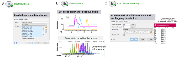 The mAb samples mimicking different biotherapeutic candidates were loaded into 96-well plate and TOF MS data were acquired using a generic LC-MS method setup. The LC and MS methods allow for the detection of different mAb species and their subunits with high data quality, skipping sample-specific optimization to address the need for fast and efficient data acquisition. To understand if the proteins were expressed as desired, raw TOF MS data needed to be deconvoluted and obtained molecular weights (MW) matched against theoretical sequence information. To initiate the processing workflow of MW determination and matching, all data files (each corresponding to a different protein sample) were imported to Biologics Explorer software at once (Figure 2A). For processing with the goal of molecular weight determination, broad criteria were defined for the retention time (RT) range used for automatic peak detection, the deconvolution and for the MW output (Figure 2B). Since different proteins will have different hydrophobicities depending on their sequences and modifications, RTs are likely to shift. Automatic peak detection within a broad RT range is therefore critical to ensure an accurate deconvolution. Similarly, the MW is likely to be different between different protein samples. Defining a wide mass range for the deconvolution output ensures the applicability for the workflow for many different samples. To automatically determine the MW of each candidate protein, MS spectra within the detected peaks were averaged and deconvoluted for all candidates at once maintaining consistency in deconvolution (Figure 2B, bottom). The matching of the resulting MW to theoretical sequences is enabled through a text file, linking the MW output of each data file to a specific theoretical mass (Figure 2C). In addition, 2 thresholds for the flagging of results can be set to distinguish between marginal and significant differences between expected and experimental masses.