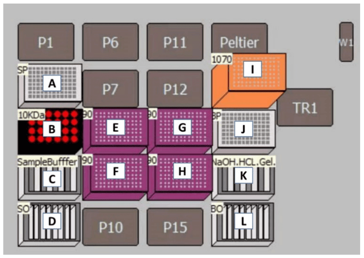 Automated sample preparation: The Biomek i5 Span-8 automated workstation was used to transfer 85 µL aliquots of sample buffer from Reagent Tank C (Figure 2) into the BioPhase 8800 sample plate wells. Next, 10 µL of the mAb sample, 2 µL of 10 kDa internal standard and 5 µL of β-ME were transferred to each well of the sample plate. This sample mixture was thoroughly homogenized using the tip mixing technique. Upon addition of the sample mixture, the method paused to allow the operator to manually set a heat-resistant film over the plate. After resuming the method, the sample plate was transferred to an on-deck custom heating plate. The sample was heat denatured and reduced at 70°C for 10 min, completing the automated sample preparation. The user then manually removed the plate from the deck and centrifuged it at 4 g for 4 min. The sample plate layout matched the sample plate design, as shown in Figure 4 (A1).