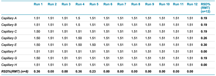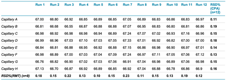 Inter- and intra-capillary precision: Representative analyses were performed using the heavy chain peak as an example. Table 4 shows the average inter- and intra-capillary %CPA values calculated for the HC peak following the analysis of 96 samples. The rightmost column of Table 4 shows the intracapillary reproducibility across runs, whereas the bottom row of the table shows the inter-capillary reproducibility. The overall reproducibility for both intra- and inter-capillary was ≤0.22%. Similarly, Table 5 shows the average inter- and intra-capillary values calculated for RMT of the HC peak following the analysis of 96 samples. The rightmost column of Table 5 shows the intracapillary reproducibility and the bottom row of the table shows the inter-capillary reproducibility of RMT. The overall reproducibility for both intra- and inter-capillary was <0.36% for RMT. Together, these results demonstrate the exceptional precision of the automated sample preparation, compared to manual sample preparation.1