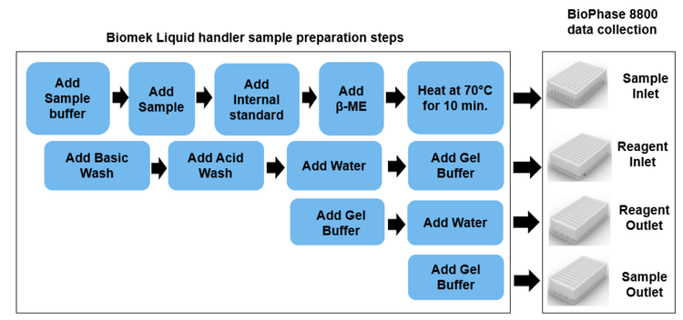 Manual sample preparation processes are labor-intensive and a potential source of human error and user variability. Three methods were developed using the Biomek i5 Span-8 automated workstation from Beckman Coulter (Figure 1). One method was developed to process up to 96 samples before CE-SDS analysis on the BioPhase 8800 system, whereas the other 2 methods were developed to prepare the reagent inlet and outlet plates using the CE-SDS kit.