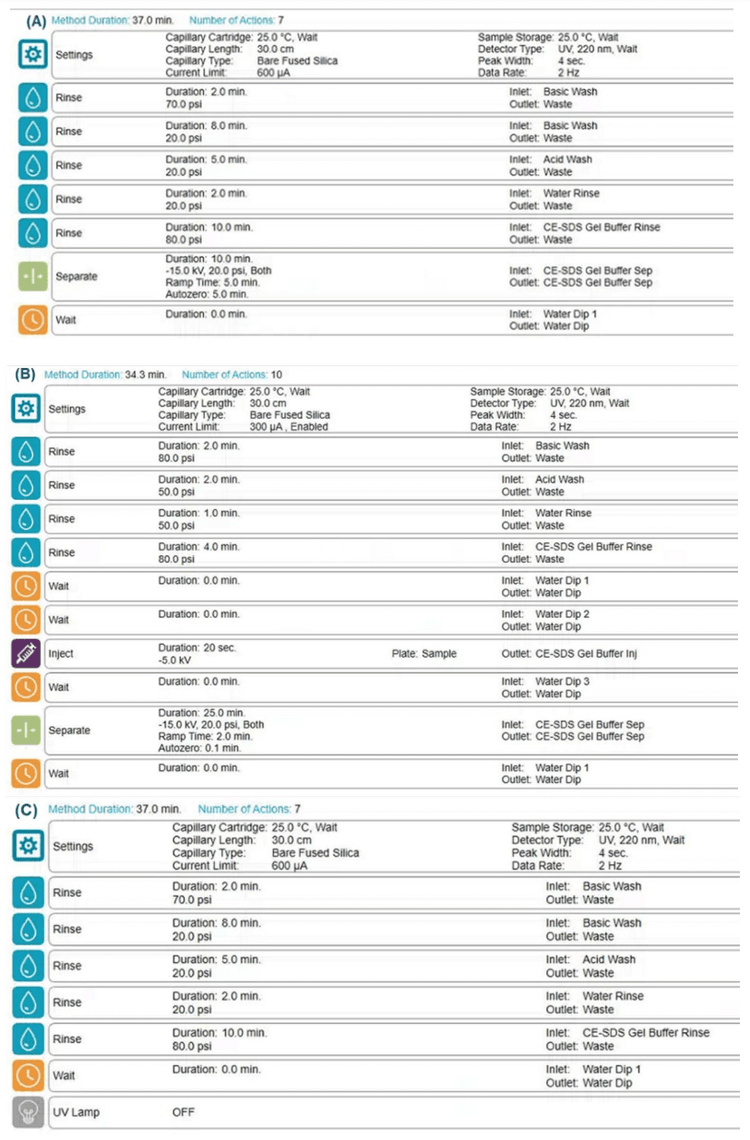 Materials: The BioPhase CE-SDS Protein Analysis kit (P/N: C30085), including the SDS-MW separation gel buffer, 10 kDa internal standard, CE-grade water and basic and acidic washes, was from SCIEX (Framingham, MA). The β-ME (P/N: M3148- 25ML) was from Sigma Aldrich (St. Louis, MO).