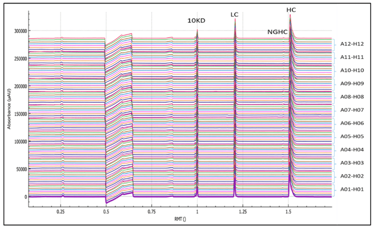 The sample and buffer plates prepared by the Biomek i5 Span-8 automated pipetting workstation were manually transferred to the BioPhase 8800 system for CE-SDS analysis. Figure 6 shows the overlay of the 96 electropherograms. The reproducibility of the CPA% and the RMT of the light chain (LC), heavy chain (HC) and non-glycosylated heavy chain (ng-HC) were calculated using the BioPhase 8800 software (Table 3). The %RSD values for RMT were 0.09%, 0.14% and 0.15% for LC, HC and ng-HC, respectively.