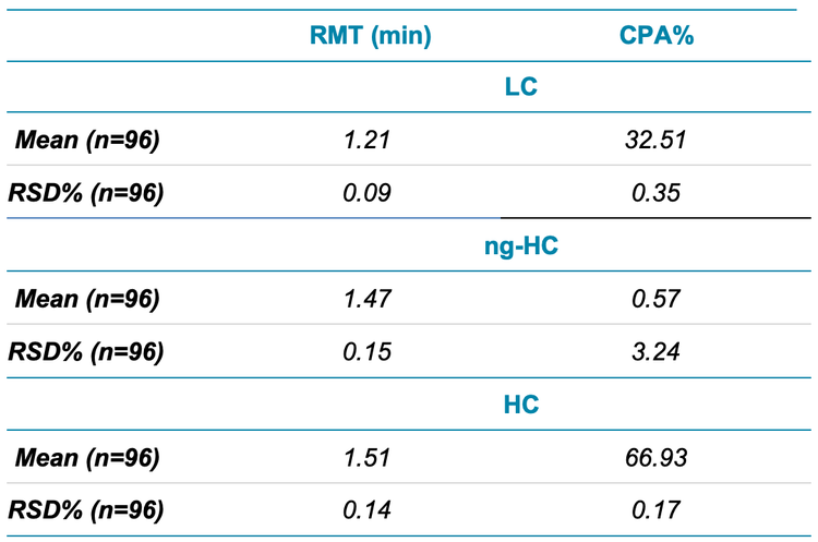 The %RSD values for CPA% were 0.35%, 0.17% and 3.24% for LC, HC and ng-HC, respectively. These results demonstrate that combining the Biomek i5 Span-8 automated workstation and the BioPhase 8800 system provides robust and reproducible analytical results.