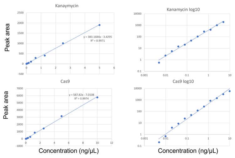 - The calibration curves generated for Kanamycin RNA and Cas9 mRNA revealed good linearity over 3 orders of magnitude (R2>0.995) with reliable detection at pg/µL concentrations