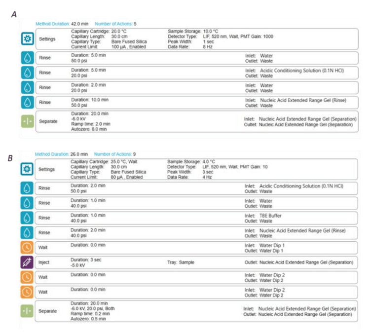 Capillary gel electrophoresis on BioPhase 8800 system: The separations were accomplished using BFS capillaries filled with PVP gel buffer. The capillary conditioning and separation method conditions are shown in Figure 2, panels A and B, respectively. The capillary conditioning method was performed at the beginning of each sequence.