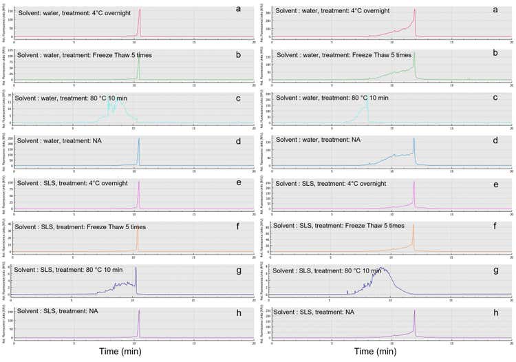 Fast assessment of different sample treatment conditions in a stability study:The Kanamycin RNA and Cas9 mRNA standards were treated in either water or 50% SLS solution to assess sample stability. Each sample type was subjected to a handling method, including overnight storage at 4°C, 10 min incubation at 80°C, or freeze-thaw. Figure 5 shows the electropherograms of the RNA standards subjected to different combinations of treatments. Notably, Cas9 mRNA is unstable in water (Figure 5: i-l), as severe degradation occurs even in the absence of a handling treatment. However, Cas9 mRNA appears to be stable in SLS solution (Figure 5: m, n, p). In contrast, Kanamycin RNA was stable in both water and SLS solution, with good peak intensity and consistent RNA profiles observed in both conditions without a handling treatment (Figure 5: d, h). The data indicate that heating the samples to 80°C for 10 min was detrimental to the integrity of both RNA molecules (Figure 5: c, g, k o), while the freeze-thaw treatment reduced signal intensity compared to control (Figure 5: b vs. d, f vs. h, n vs. p). For Kanamycin RNA, overnight storage at 4°C slightly reduced the signal compared to control (Figure 5: a vs. d, e vs. h).