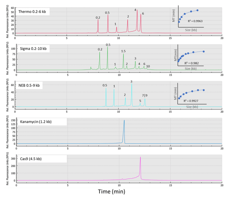 Based on the RNA ladders, the estimated sizes of the Kanamycin RNA and Cas9 mRNA were slightly larger than expected. This discrepancy might be explained by differences in the nucleic base composition of the ladders and RNA standards. The PVP and urea composition of the separation gel could be optimized to better resolve larger RNA sizes and improve accuracy for size determination. This workflow achieved simultaneous analysis of RNA standards and ladders from different vendors which would be beneficial for fast RNA size determination and identifying the most suitable RNA ladder to use.