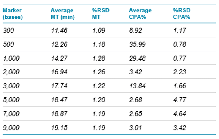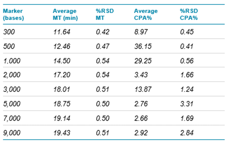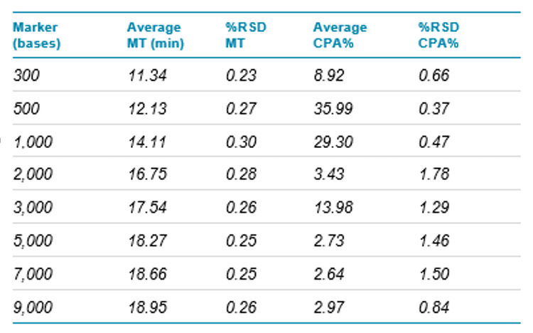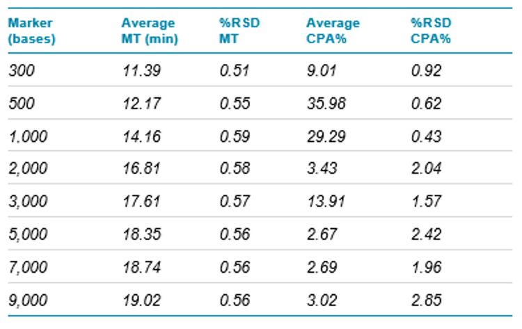 Table 3. Inter-capillary reproducibility: %RSD of MT and CPA% of RNA markers in the ssRNA ladder. N=8.