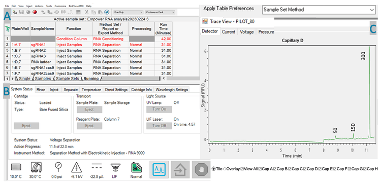 Figure 2. The status panel in the BioPhase 8800 driver for Empower software.  Panel A shows the table of the active sample sets with sample names, well positions and instrument methods indicated. Panel B provides commands for instrument control and real time monitoring of instrument status. Panel C displays the Trace View for real time monitoring of detector response, current, voltage and pressure for all 8 capillaries. In this example, the electropherogram for capillary D shows that 3 size standard fragments (50, 150 and 300 bases) of the ssRNA ladder were detected in 11.5 minutes.