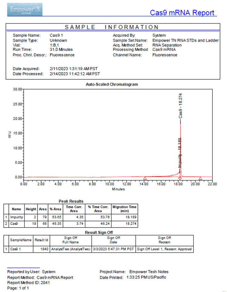 Figure 5. Cas9 mRNA report generated using the Empower CDS. The top panel lists sample, data acquisition and data processing method information. The middle panel displays the electropherogram with peak integration and annotation. Finally, the lower panel shows the “Peak Results” table and the “Result Sign Off” table with the audit trail.