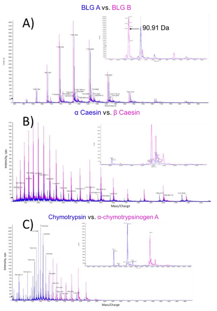 Six protein standards in sequential wells were analyzed using the Echo® MS+ system with the ZenoTOF 7600 system. This is an example of protein modification analysis in a high-throughput screening environment. Bovine β-lactoglobulin (BLG) has 2 genetic variants, BLG-A and BLG-B, which differ in 2 out of 162 residues.5 In the case of sequence mutations, differences in the intact mass can rapidly reveal variances in the primary sequences by comparing the 2 data files (Figure 5A). The α and β-casein proteins from bovine milk were analyzed in a subsequent well to evaluate phosphorylation differences (Figure 5B). Phosphorylation is essential for precisely controlling cellular processes, allowing cells to respond and adapt to various signals and environmental conditions. It is a versatile and dynamic mechanism for regulating protein function, signal transduction, enzyme activity, cell cycle progression and membrane transport.6,7 Chymotrypsinogen is an inactive precursor of chymotrypsin, an enzyme that breaks down proteins.8 Chymotrypsinogen remains inactive until it reaches the digestive tract to prevent undesired cleavage. Activation occurs when trypsin cleaves a specific peptide bond on α-chymotrypsinogen (pink trace of Figure 5C) to form active chymotrypsin (blue trace of Figure 5C). This leads to the formation of π-chymotrypsin, which further reacts with other molecules to produce α-chymotrypsin. The yield of α-chymotrypsin can be influenced by factors such as inhibitors, pH, temperature and calcium chloride.