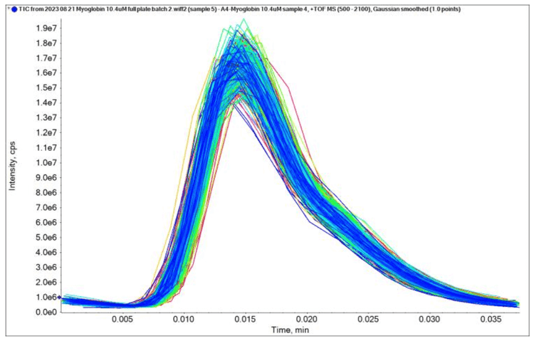 The speed of the Echo® MS+ system with ZenoTOF 7600 system allows for 384 samples completed in as little as 8 minutes. Data is collected in a single data file and automatically split during post-processing, with the well position indicated in the split data file. Due to the low volume of the acoustic ejections in the nanoliter range, a significant concern is the reproducibility of the ejections across an entire 384-well plate. An overlay of 384 split ejections of 10.4µM intact myoglobin is shown in Figure 3 with a calculated %CV of peak area under 10%.