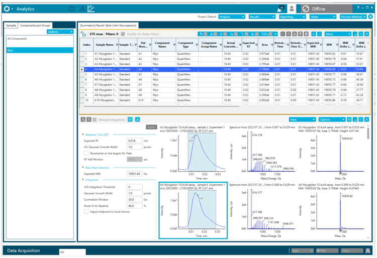 The SCIEX OS software enables targeted analysis and deconvolution of large intact molecules on a per-well basis, providing TIC, extracted MS for a single well, and reconstructed mass. The ejection status, time, and volume can be observed on a per-well basis to check the data quality. The split data file can be processed for the target protein mass at a reconstruction resolution of 5000. The reconstruction mass output range was set between 15 kDa and 20 kDa. The reconstructed masses were found at 16,951 Da, matching literature values (Figure 4).4 Once a specific processing method is determined, the results file can be generated through batch submission after acquisition. The reviewed data in SCIEX OS can be directly integrated with a laboratory information management system (LIMS) for key information storage.
