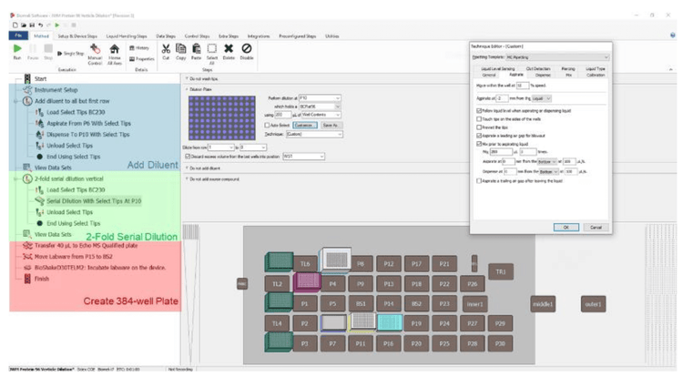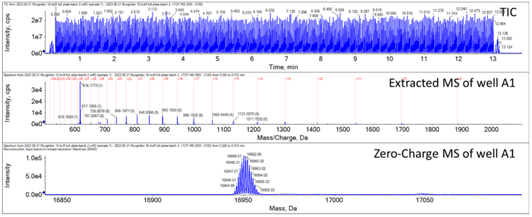 Sample preparation: Protein standards for myoglobulin, β-lactoglobulin A and B (BLG A and BLG B, respectively), α and β casein, chymotrypsin, α-chymotrypsinogen A and bovine serum albumin were purchased from Sigma Aldrich. Proteins were diluted at 1 mg/mL concentration in 70:30 (v/v), ACN/H2O with 0.1% formic acid. Protein stocks were diluted to 20µM before further dilution with the Biomek i7 liquid handler. Assay plates were prepared using the Biomek i7 Automated Workstation from Beckman Coulter® Life Sciences. Using selective tip pipetting, a single row of 12 tips was loaded on the 96-multichannel pipetting head to execute a 2-fold serial dilution vertically down the plate to obtain an 8-point concentration. The samples were then stamped into each quadrant of a 384-well plate (Figure 2B). Before the analysis on the prototype system, 50 μL of the sample was transferred to a well of an Echo® MS+ system-qualified 384-well polypropylene (PP) microtiter plate. The plate was centrifuged at 1,530 x g for 2 minutes.