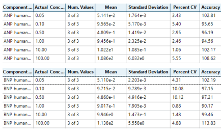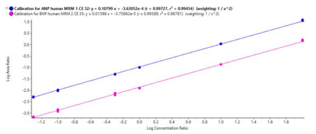 As shown in Figures 3, 4 and 5, both ANP and BNP are robustly quantified at 0.05 ng/mL in rat plasma, with tight %CV (<11%) and high accuracies (90-114%) across the entire linear dynamic range (0.05-100 ng/mL). 100 ng/mL is the highest concentration prepared in the sample set, the assay ULOQ would potentially be higher than 100 ng/mL as saturation was not yet reached.
