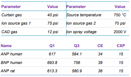 Sample preparation: Rat plasma was protein precipitated and loaded onto the mixed mode SPE cartridge. The eluents were diluted 1:1 (v/v) by water and served as the processed biological matrix. Human ANP, human BNP and rat ANP were spiked into the processed rat plasma, endogenous rat ANP was used as the internal standard. Serial dilution with processed plasma was performed to create the calibration curves for analysis.