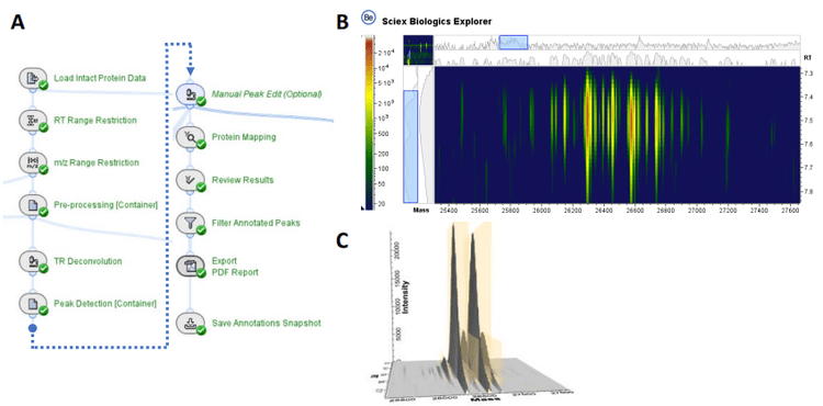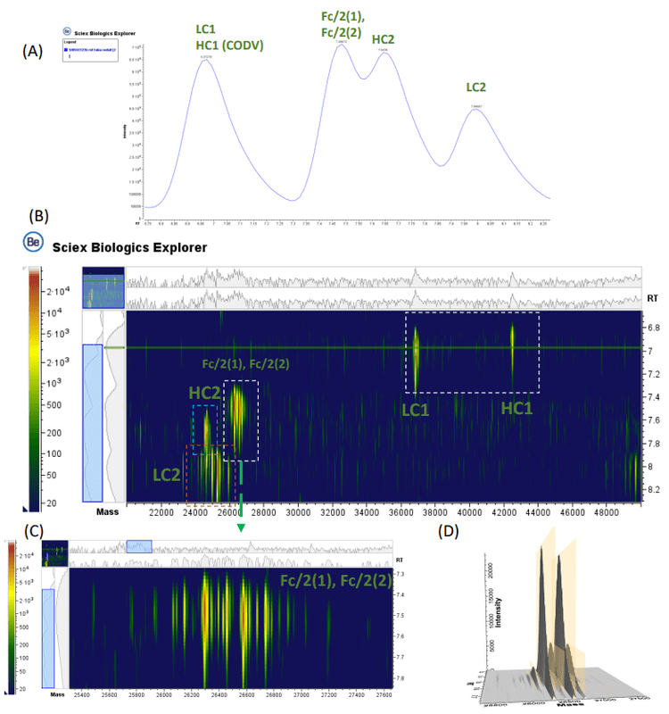 Data processing: Data were processed with Biologics Explorer software. Raw data (.wiff2) collected with the X500B QTOF system were directly loaded into the workflows. Intact mass analysis was conducted in the automated deconvolution workflow and the TRD workflow was selected for subunit analysis.